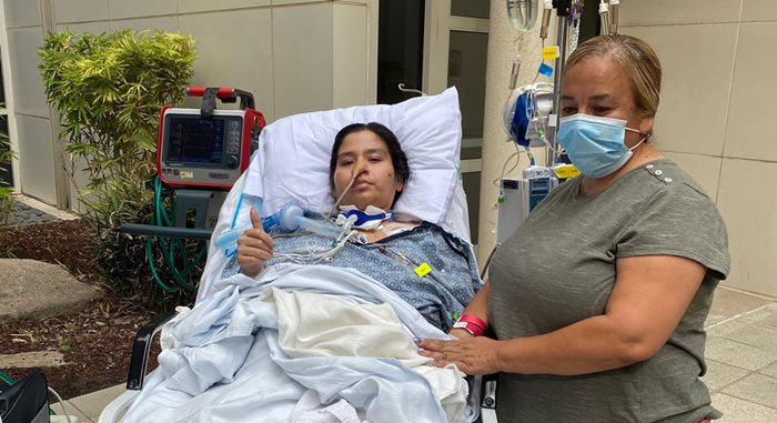 To keep her alive, Dr. Fayed and his team started a treatment called Extracorporeal Membrane Oxygenation (ECMO) – where huge tubes from a machine divert 80% of the blood out of the body to load it with oxygen and then inject it back into the body to circulate. It was the only chance Manoz had to survive and Community Regional is the only hospital in the Valley with the expertise and team to manage ECMO patients. She was on ECMO for 28 days.